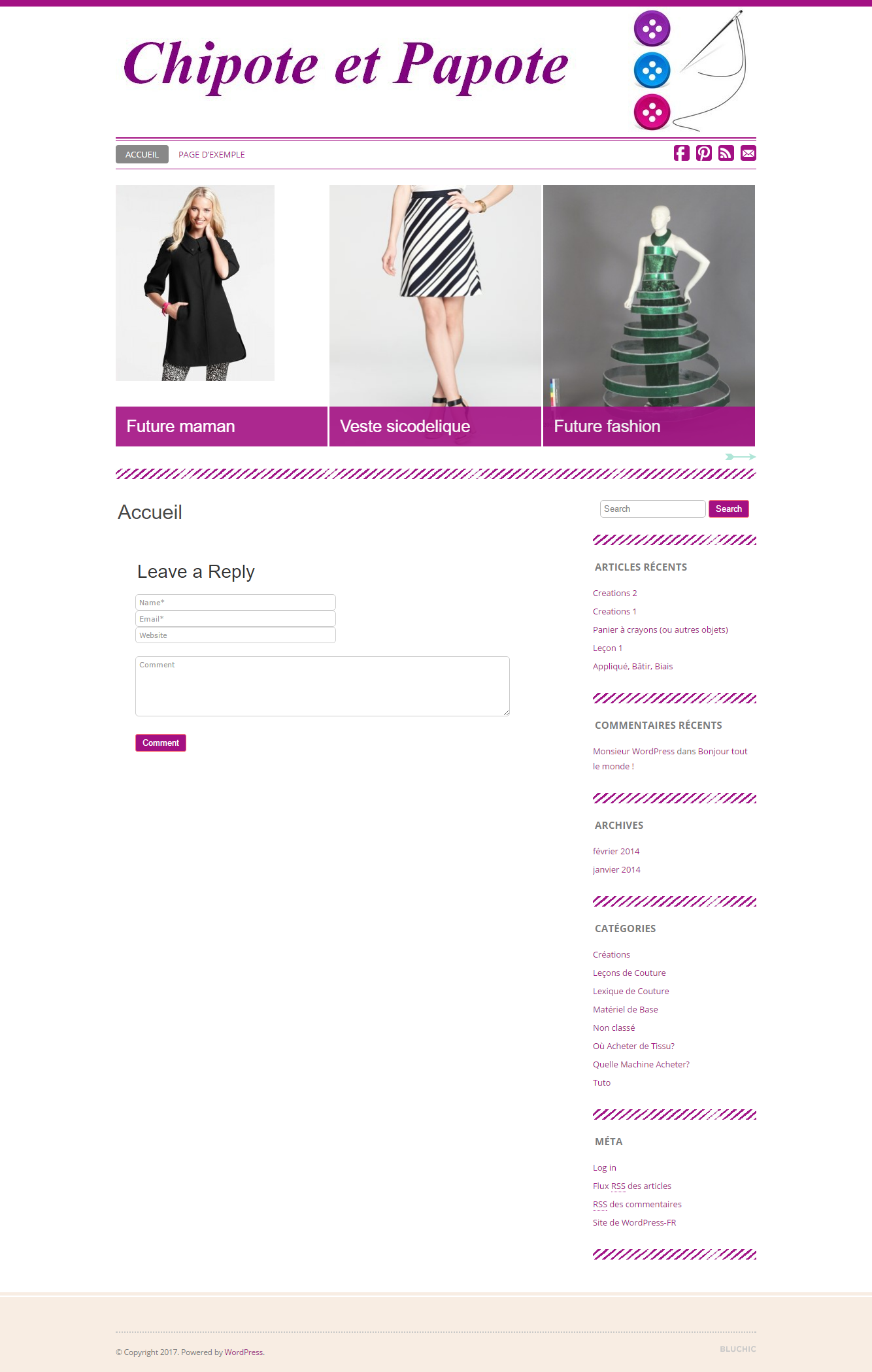 Site Blog pour une boutique, mercerie. Il est fait avec Wordpress et le thème Camomille légèrement modifié. Le site a plusieurs de catégories, ainsi que de pages pour voir les catégories de manière individuelle, il y a de liens vers les réseaux sociaux, ainsi qu'un page de contacte.